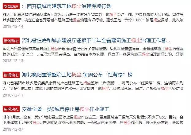 除了承接上游傳導(dǎo)而來(lái)的環(huán)保轉(zhuǎn)型壓力外,下游建筑企業(yè)還不得不同時(shí)經(jīng)受環(huán)保風(fēng)暴中的揚(yáng)塵整治壓力:每到秋冬季節(jié),建筑工地?fù)P塵治理工作都是各地的監(jiān)管重點(diǎn)。在生態(tài)環(huán)保部明確指出禁止“一刀切”做法的同時(shí),各地為確保揚(yáng)塵治理達(dá)標(biāo)也“各出奇招”,如被列入湖北襄陽(yáng)揚(yáng)塵整治“紅”榜的企業(yè)將在招投標(biāo)活動(dòng)中受到限制。
