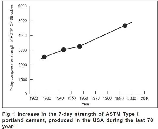 有了更先進(jìn)的施工工藝,人們就希望可以更快地完成工程項(xiàng)目,因此漸漸提高了對工期的要求,這也就隨之導(dǎo)致要求混凝土具有越來越高的早期強(qiáng)度。為了實(shí)現(xiàn)早期強(qiáng)度,用水量不能太高,因此只能將水泥做得更細(xì)。1970年美國的ASTM Type I 波特蘭水泥中C3S含量提升到50%,使得細(xì)度達(dá)到了300m2/kg,這對混凝土的性能影響巨大,1945年,0.47水灰比已經(jīng)可以達(dá)到28d強(qiáng)度31MPa。