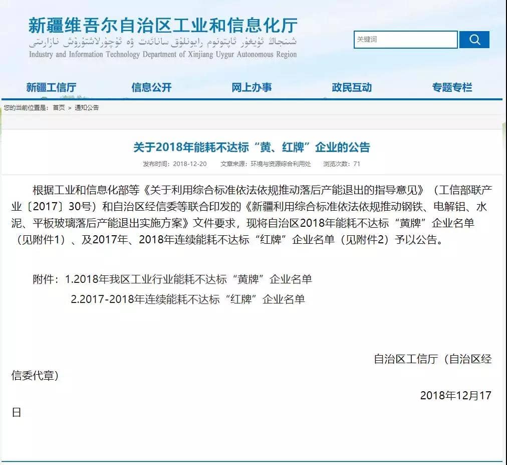 2018年工業(yè)行業(yè)能耗不達(dá)標(biāo)“黃牌”企業(yè)名單