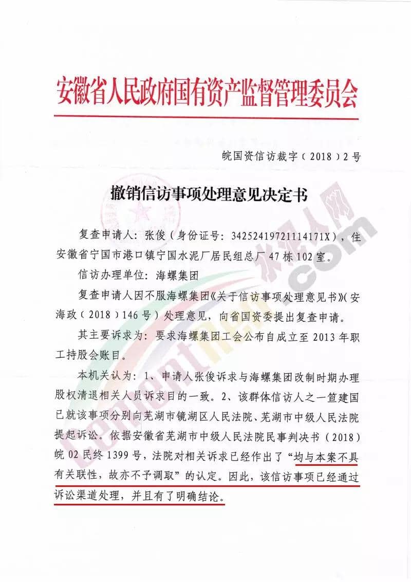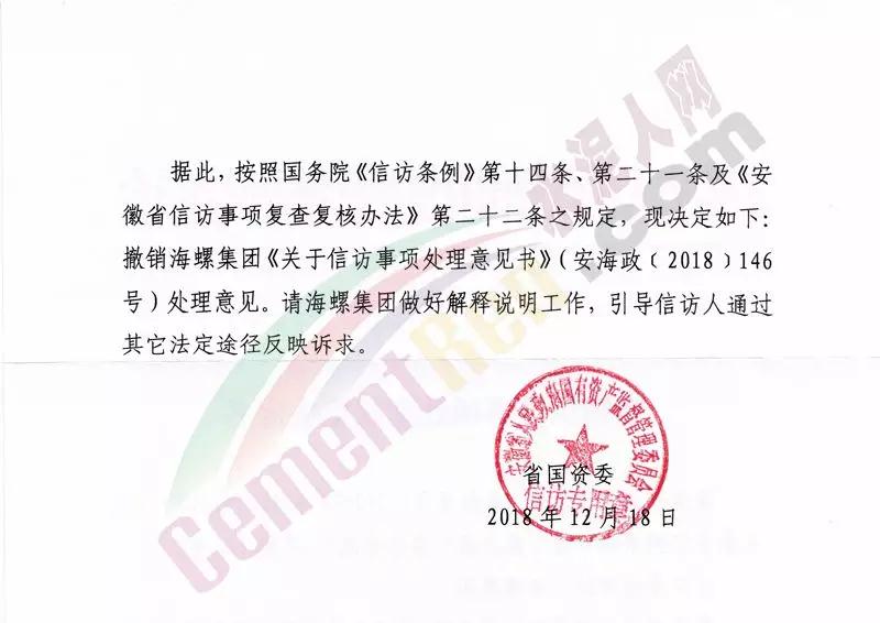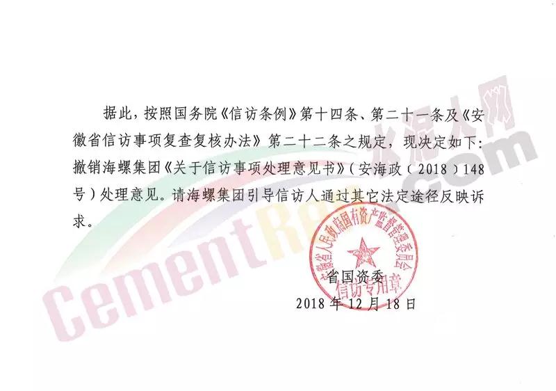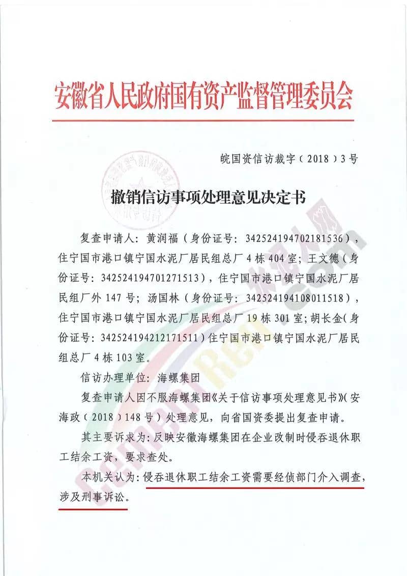 同期,安徽省人民政府國(guó)有資產(chǎn)監(jiān)督管理委員會(huì)發(fā)布了《撤銷信訪事項(xiàng)處理意見決定書》(皖國(guó)資信訪裁字【2018】3號(hào))文件。文件稱,針對(duì)相關(guān)人員反映海螺集團(tuán)在企業(yè)改制時(shí)侵吞退休職工結(jié)余工資一事。需要經(jīng)偵部門介入調(diào)查,涉及刑事訴訟。按照國(guó)務(wù)院《信訪條例》相關(guān)條款規(guī)定,撤銷海螺集團(tuán)《關(guān)于信訪事項(xiàng)處理意見書》(安海政【2018】148號(hào))處理意見。請(qǐng)海螺集團(tuán)引導(dǎo)信訪人通過其他法定途徑反映訴求。文件原文如下: