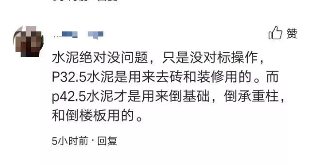 2、還有的網(wǎng)友說:水泥絕對沒問題,只是沒對標操作,P32.5水泥是用來去磚和裝修用的。而P42.5水泥才是用來倒基礎(chǔ),倒承重柱,和倒樓板用的。