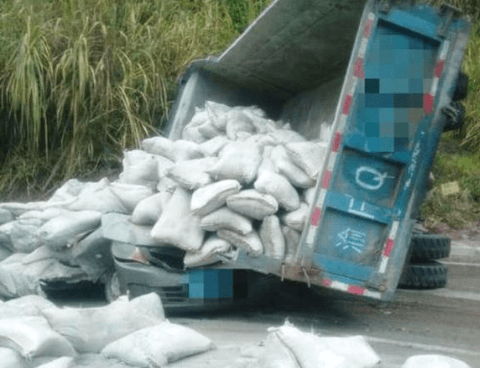 從現(xiàn)場地照片上可以看到,一輛藍色的大貨車側(cè)翻壓在一輛面包車上,滿車的水泥一袋袋掉落,砸在地面上和面包車上。