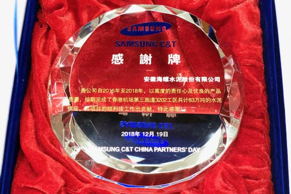 2018年12月19日上午,韓國(guó)三星物產(chǎn)公司在上海元一希爾頓酒店召開(kāi)中國(guó)供應(yīng)商大會(huì),上海海螺國(guó)貿(mào)受邀參加了會(huì)議,會(huì)議授予海螺水泥“優(yōu)秀供應(yīng)商”稱(chēng)號(hào),向海螺水泥在確保香港國(guó)際機(jī)場(chǎng)第三跑道DCM項(xiàng)目3202標(biāo)段順利竣工做出的卓越貢獻(xiàn)表示感謝。