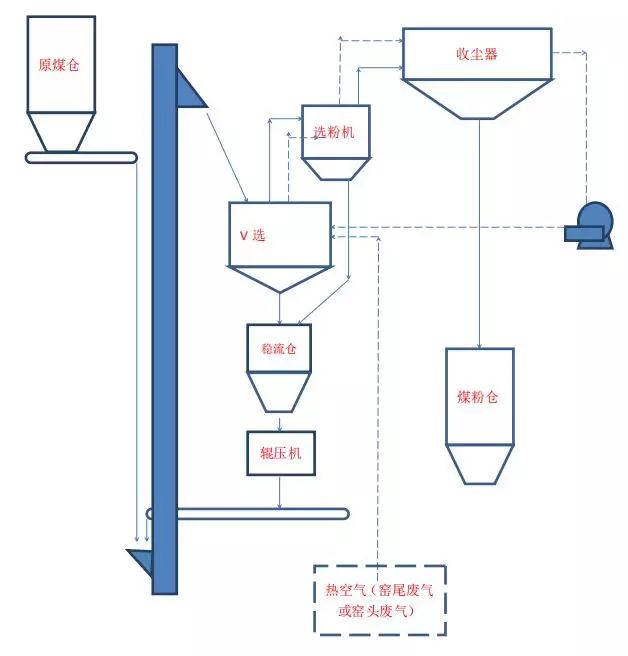 主要設(shè)備:原煤倉、皮帶秤、輥壓機(jī)、提升機(jī)、防爆V選(粗選)、選粉機(jī)、防爆收塵器及排風(fēng)機(jī)、螺旋輸送機(jī)(可正反轉(zhuǎn))及煤粉倉。