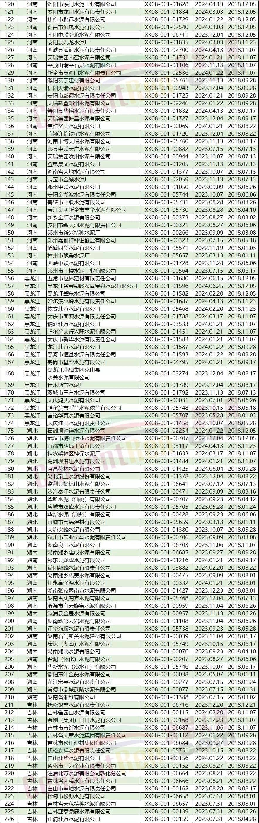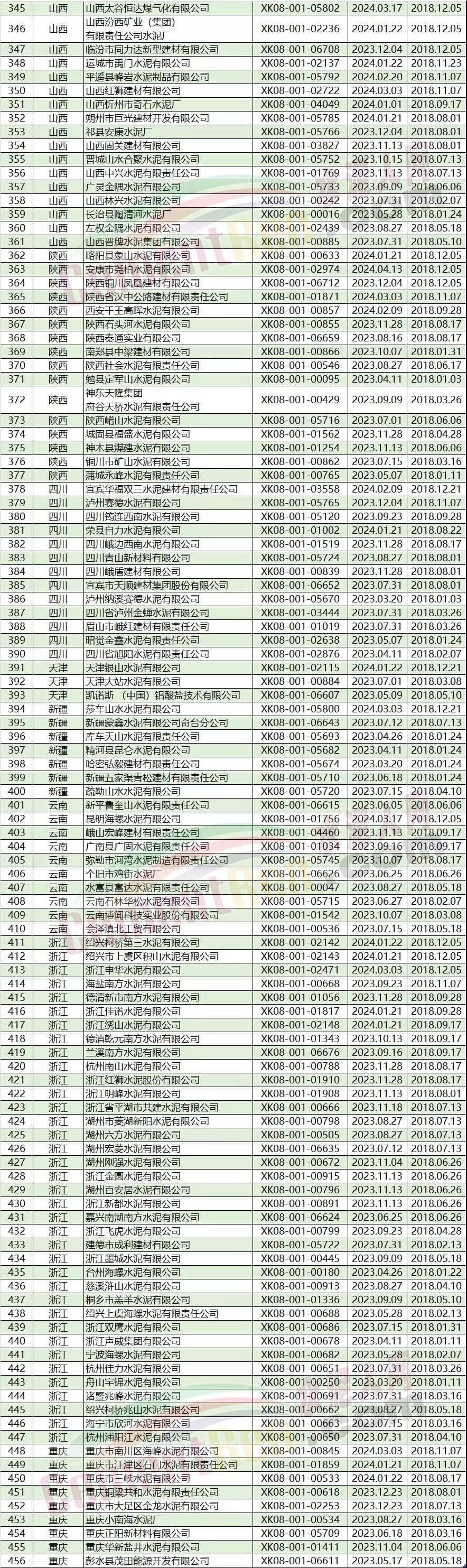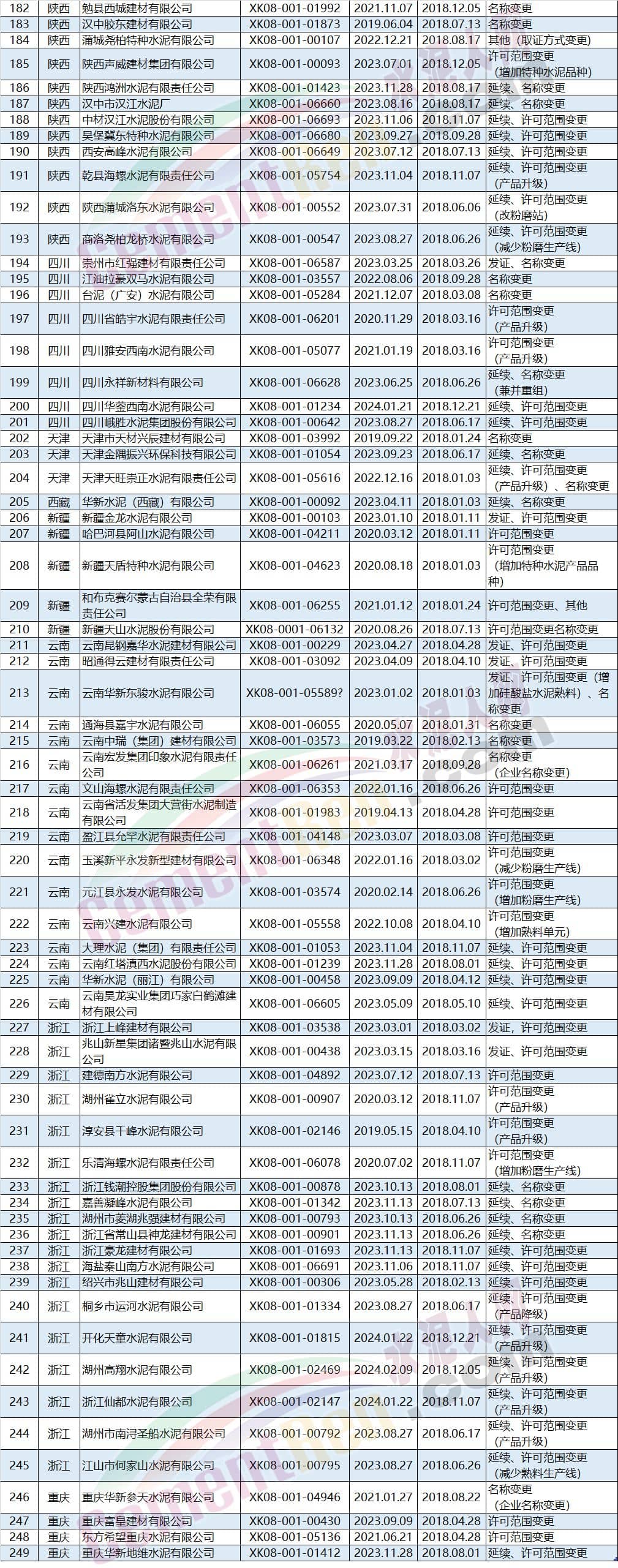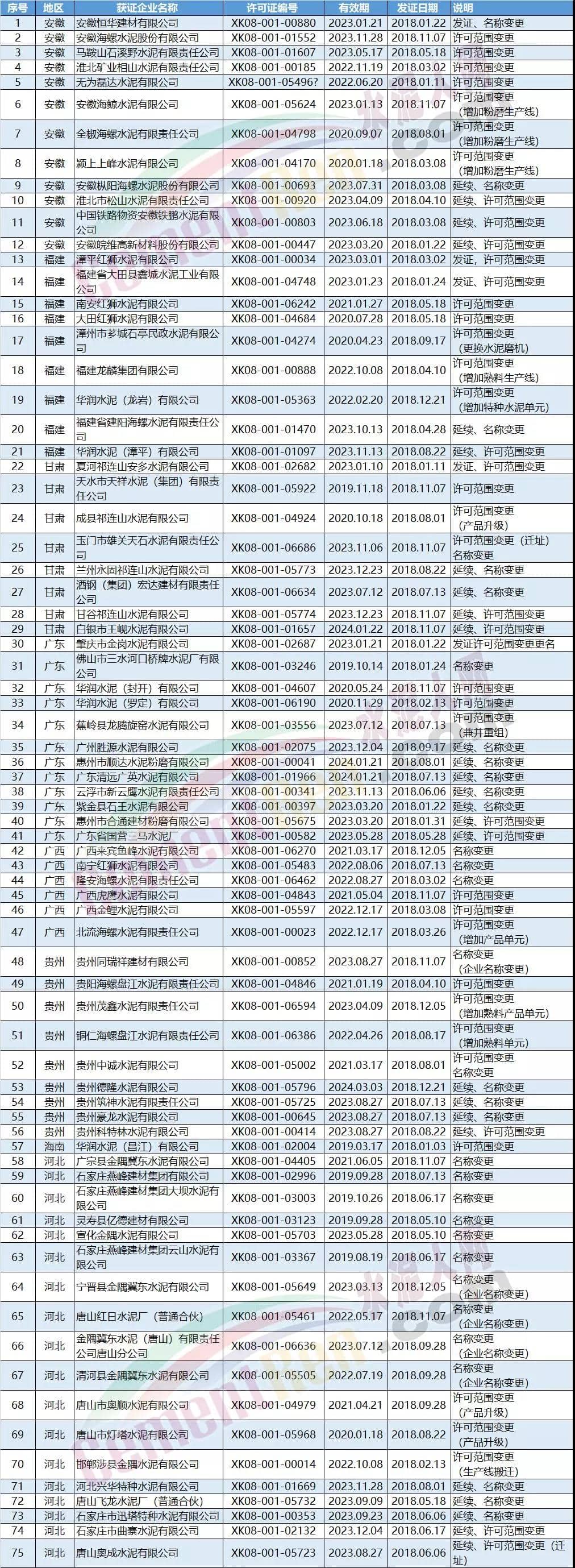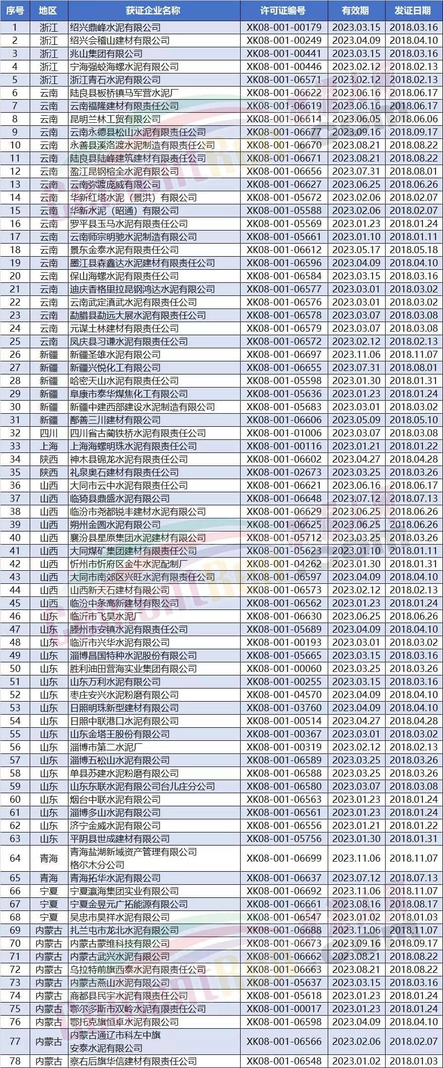 內(nèi)蒙、山西、河北各發(fā)放10個編號水泥企業(yè)生產(chǎn)許可證。福建、甘肅 、廣西、寧夏、青海 、新疆、貴州、河南 、湖南、湖北、浙江、上海、遼寧、吉林、黑龍江、江蘇、江西、山東、陜西、四川等區(qū)域也有新發(fā)證書。
