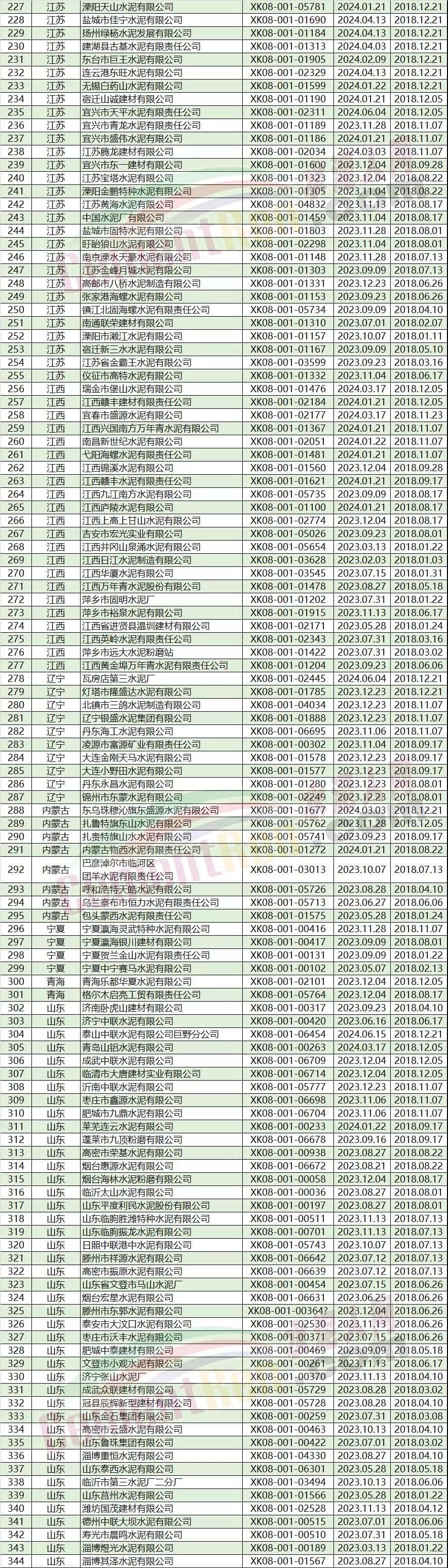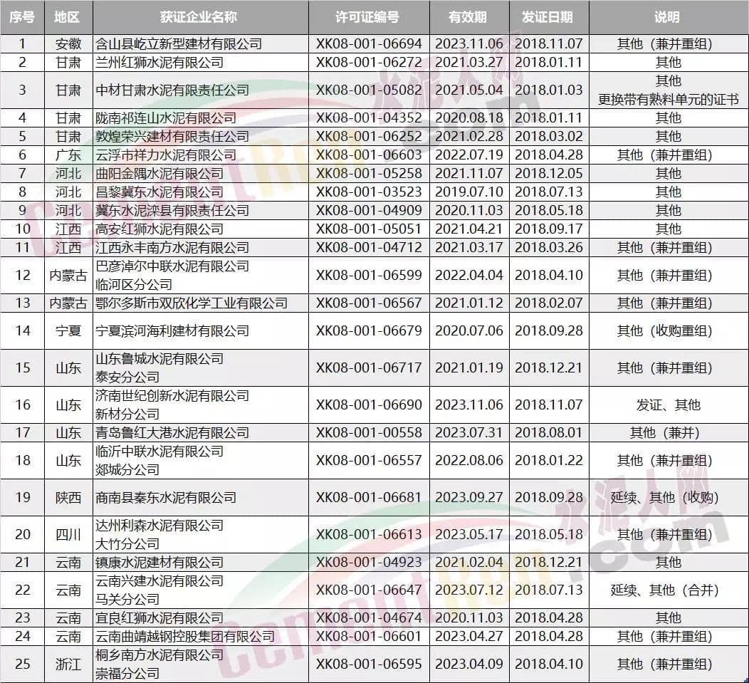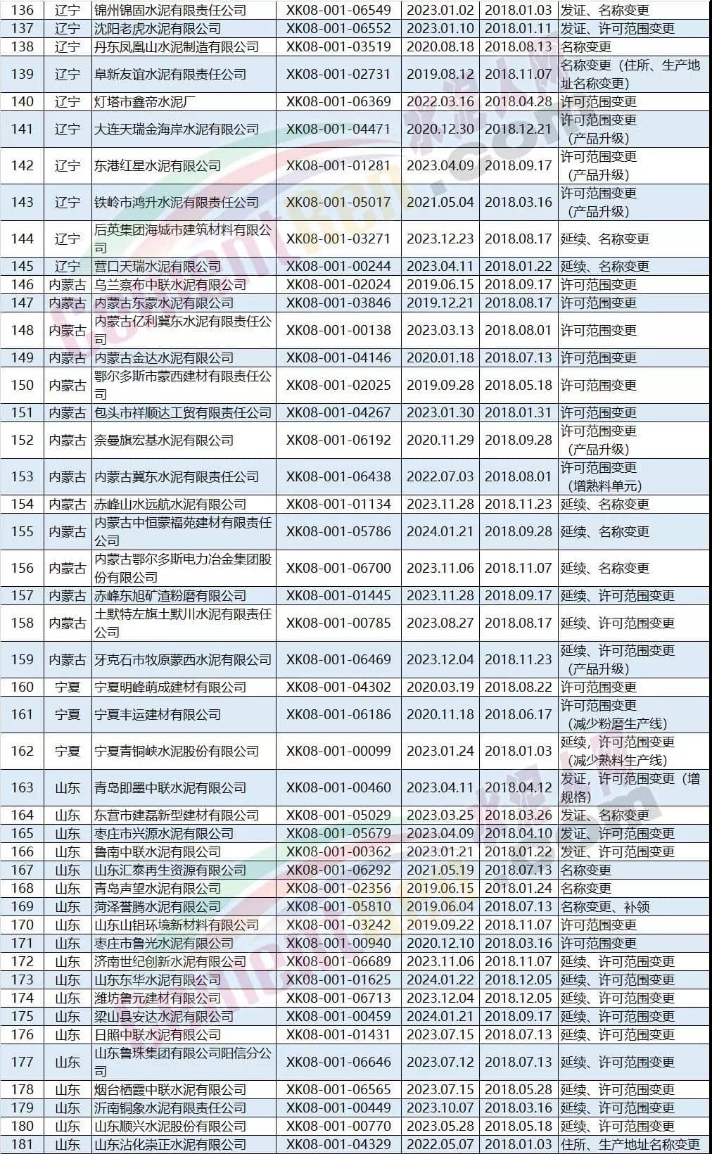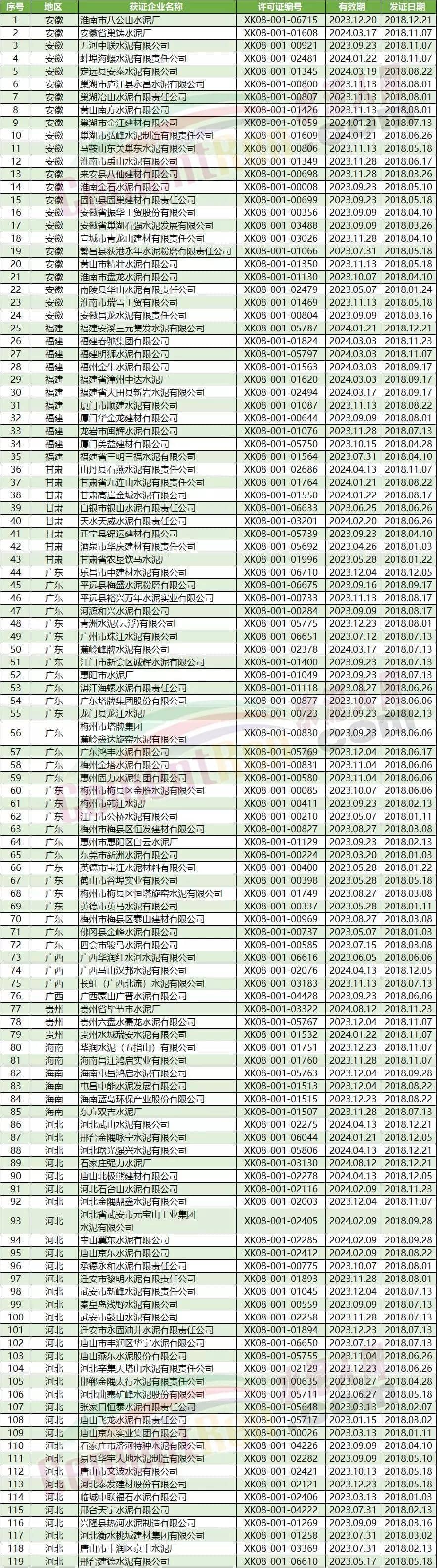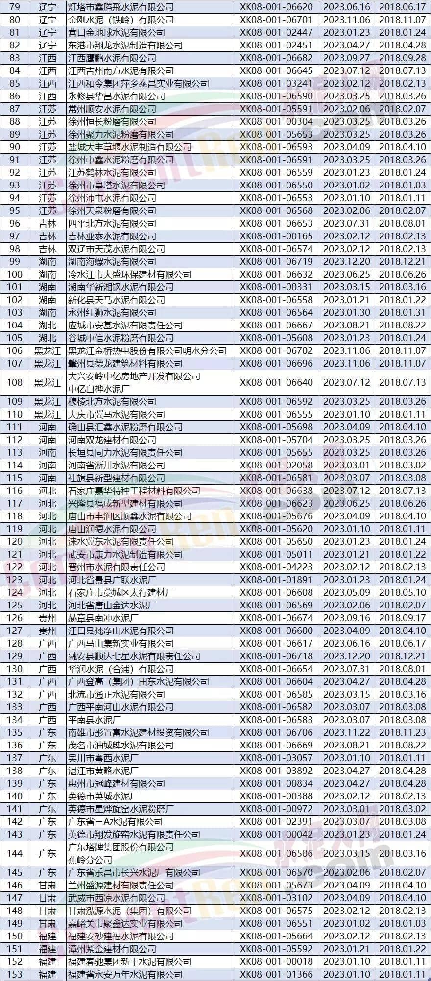 據(jù)水泥人網(wǎng)了解新版《水泥產(chǎn)品生產(chǎn)許可證實施細則》于2018年12月1日正式實施。上述列表中的153家企業(yè),有一部分是因證書到期未延續(xù)被注銷后又重新申請的,還有一部分是新建生產(chǎn)線第一次申領(lǐng)水泥產(chǎn)品生產(chǎn)許可證書。詳情如下: