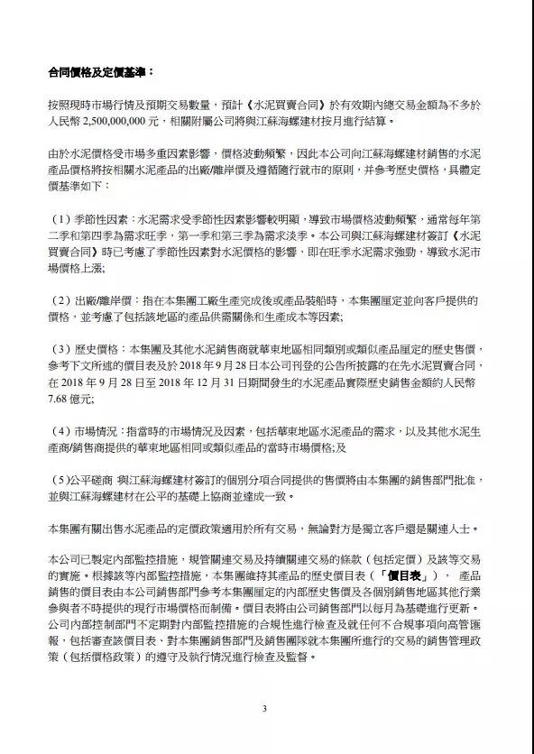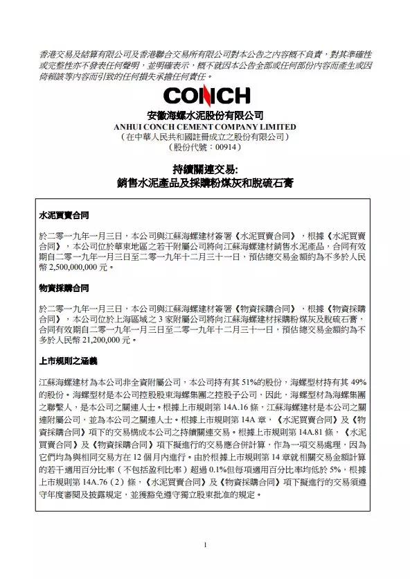 水泥人網(wǎng)通訊員消息:2019年1月3日,海螺水泥(00914.HK)公布,公司與江蘇海螺建材簽署《水泥買賣合同》,根據(jù)《水泥買賣合同》,公司位于華東地區(qū)的若干附屬公司,將向江蘇海螺建材銷售水泥產(chǎn)品,合同有效期自2019年1月3日至2019年12月31日,預(yù)估總交易金額約為不多于人民幣25億元。