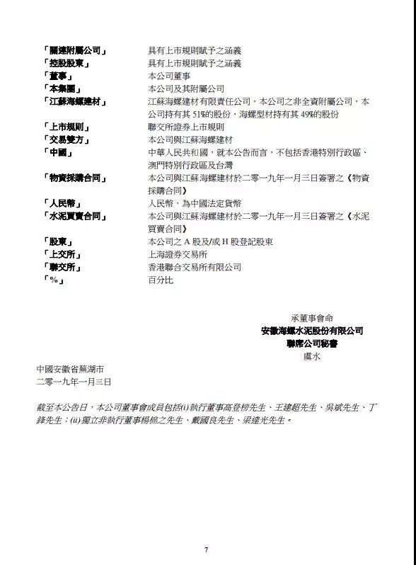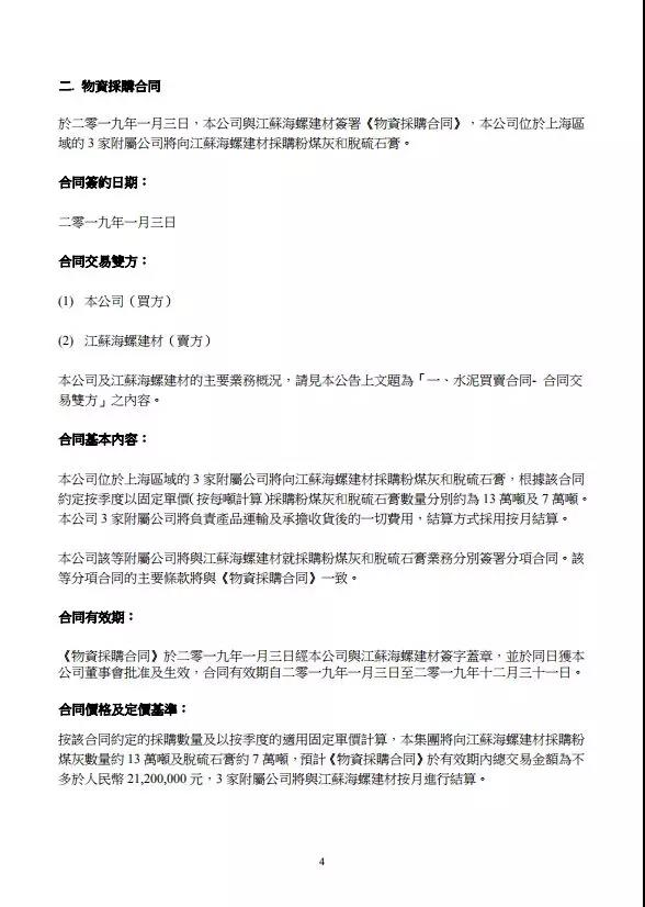 同日,公司與江蘇海螺建材簽署《物資采購合同》,根據(jù)《物資采購合同》,公司位于上海區(qū)域的3家附屬公司將向江蘇海螺建材采購粉煤灰及脫硫石膏,合同有效期自2019年1月3日至2019年12月31日,預(yù)估總交易金額約為不多于人民幣2120萬元。