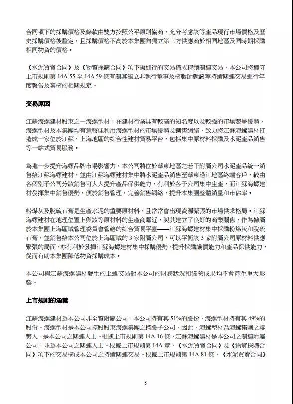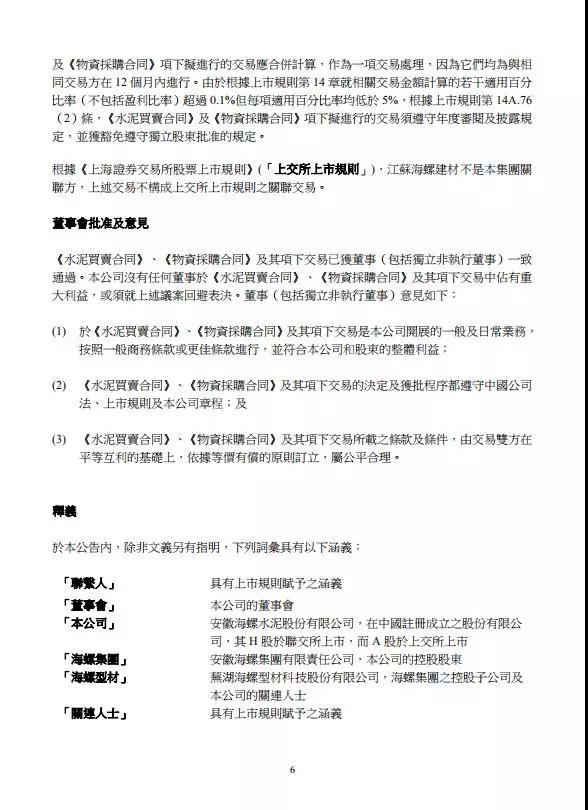 根據(jù)上市規(guī)則第14A.16條,江蘇海螺建材是公司關(guān)連附屬公司,并為公司關(guān)連人士。根據(jù)上市規(guī)則第14A章,《水泥買賣合同》及《物資采購合同》項(xiàng)下的交易構(gòu)成公司持續(xù)關(guān)連交易。
