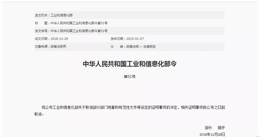 對(duì)于出臺(tái)本次《決定》的原因,工信部政策法規(guī)司解釋證明事項(xiàng)清理工作是黨中央、國(guó)務(wù)院減證便民、優(yōu)化服務(wù)的重要舉措。“根據(jù)《關(guān)于做好證明事項(xiàng)清理工作的通知》(國(guó)辦發(fā)〔2018〕47號(hào))要求和司法部的統(tǒng)一部署,工業(yè)和信息化部組織開展了證明事項(xiàng)清理相關(guān)工作,全面摸底梳理,深入研究論證,形成了《決定》。”