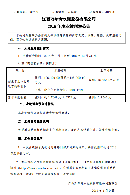 萬(wàn)年青發(fā)布業(yè)績(jī)預(yù)增公告。2018年度預(yù)盈10.64億元至12.5億元,同比增長(zhǎng)130%-170%。報(bào)告期水泥、商砼產(chǎn)品較上年同期銷量上升、售價(jià)上漲。