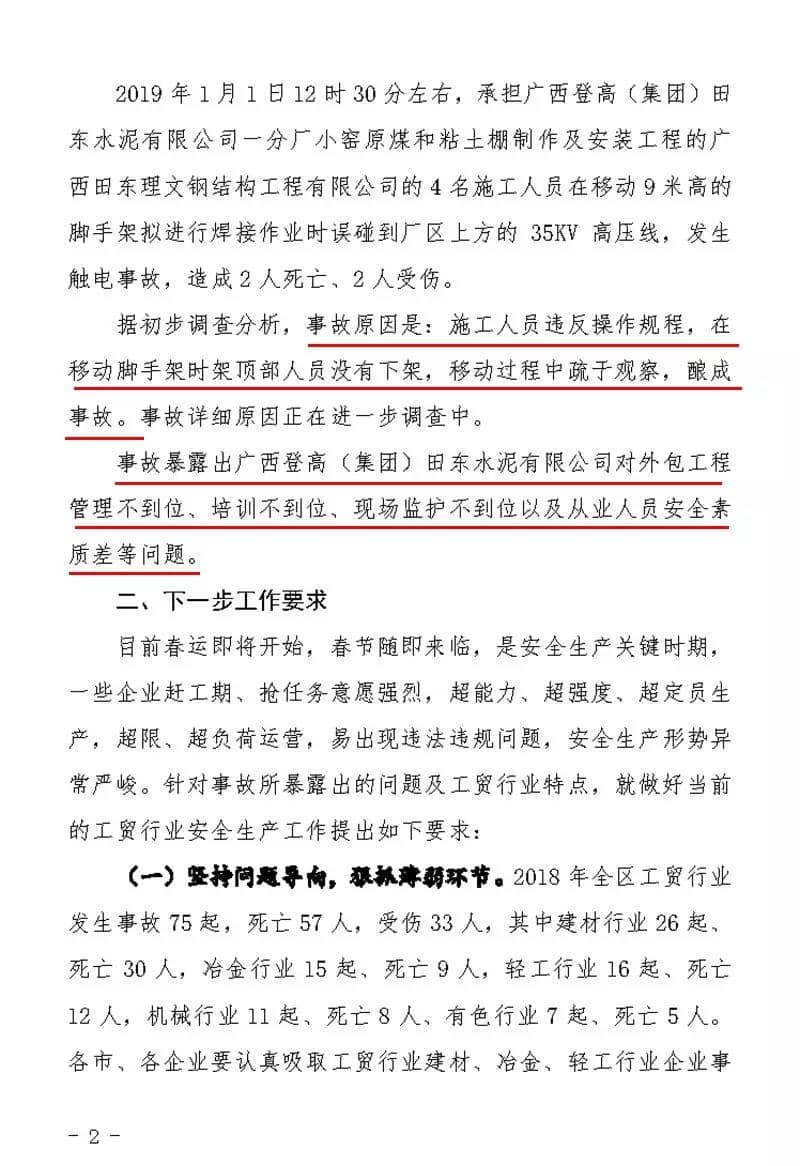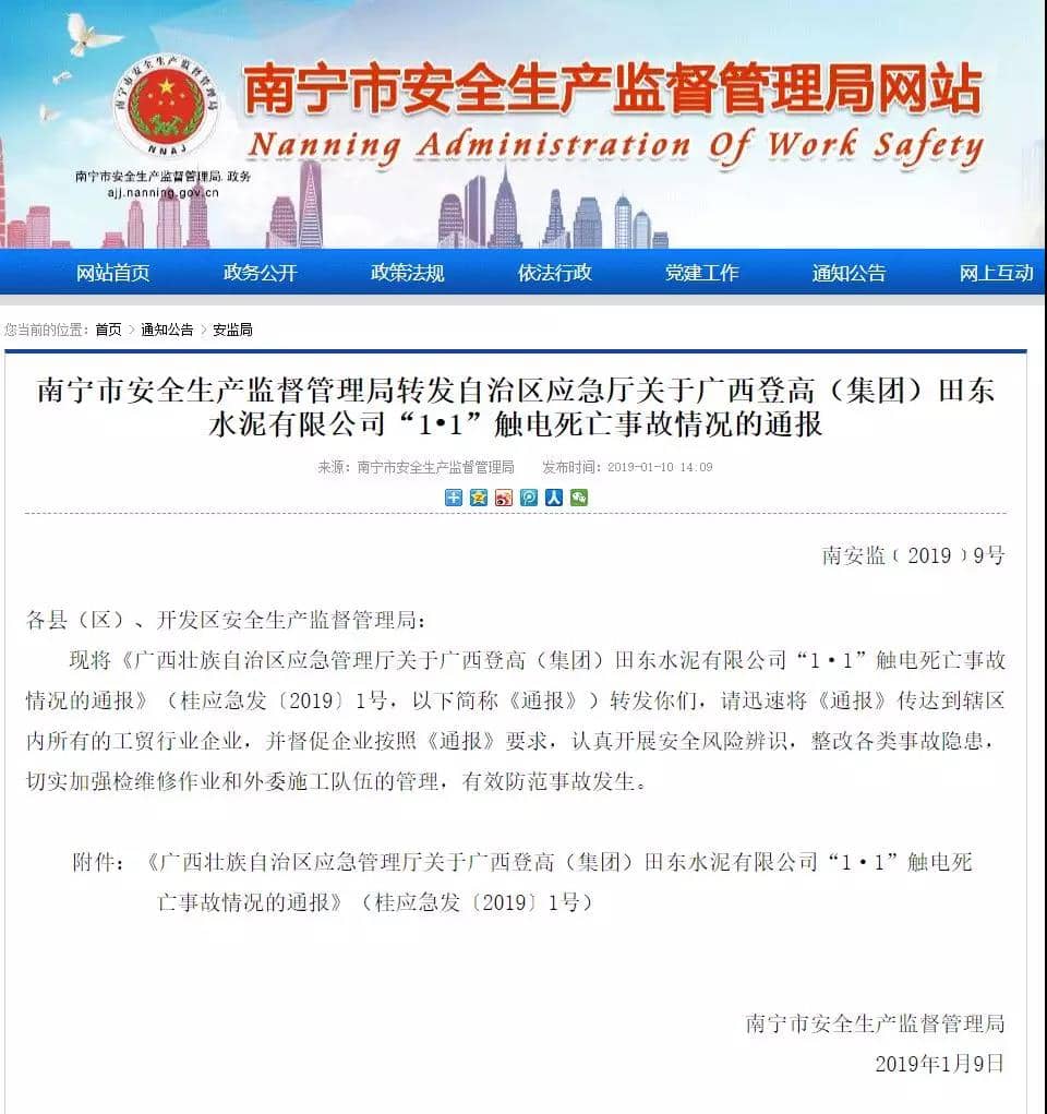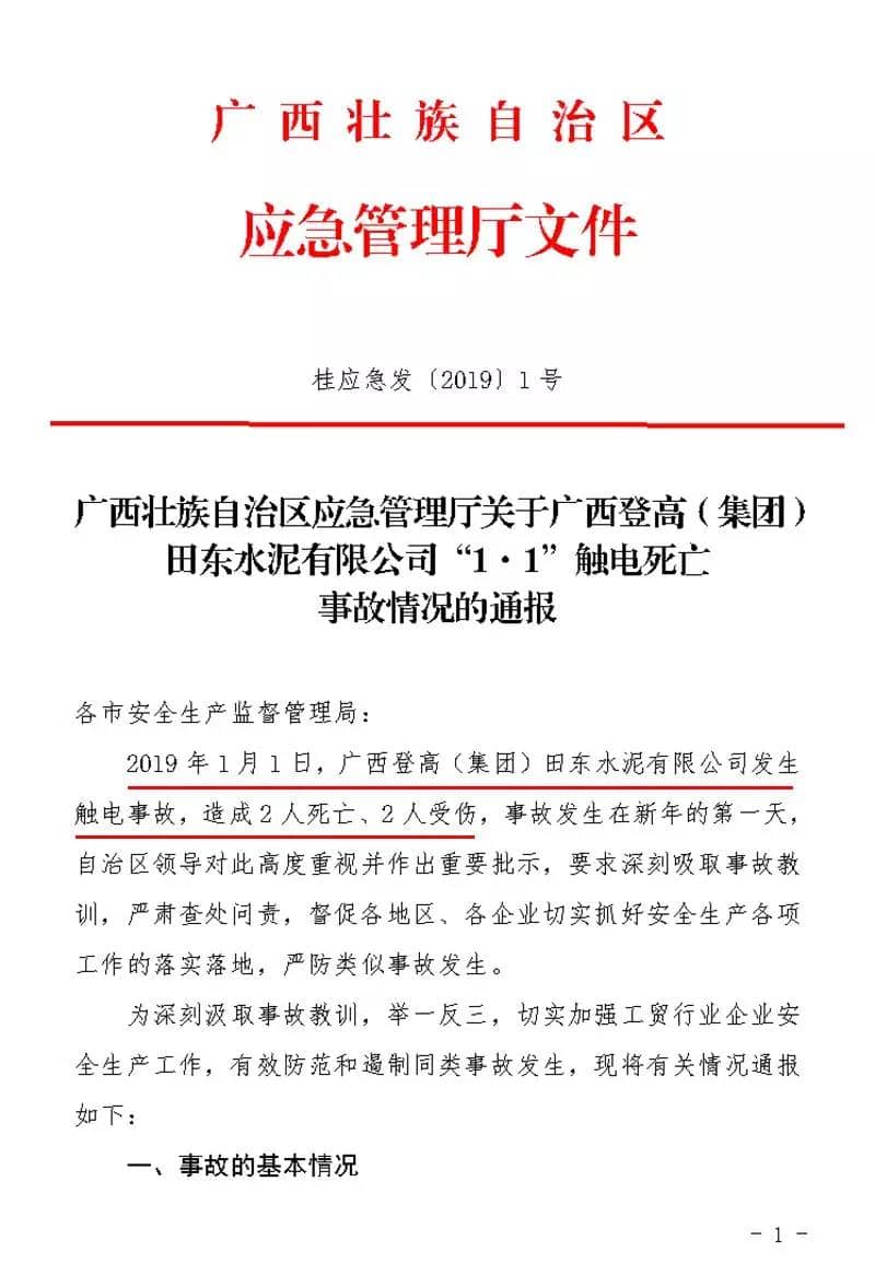 附:廣西壯族自治區(qū)應急管理廳關于廣西登高(集團)田東水泥有限公司“1_1”觸電死亡事故情況的通報