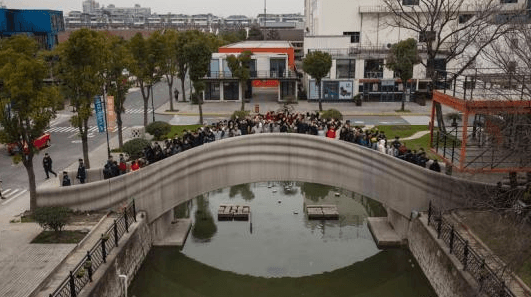 1月12日,世界最大規(guī)模3D打印混凝土步行橋在滬落成啟用,人們站在橋體上歡慶該新興建筑體的誕生。