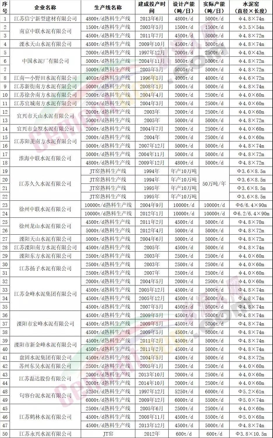 備注:上述數(shù)據(jù)來源于水泥人網(wǎng)信息中心數(shù)據(jù)庫(kù),截止2017年12月31日位于江蘇省鎮(zhèn)江市潤(rùn)州區(qū)韋崗街道的江蘇聯(lián)合水泥有限公司的6000t/d熟料生產(chǎn)線(Φ5.2×61m水泥窯)已按100萬(wàn)噸/年產(chǎn)能公告,用于產(chǎn)能置換 。