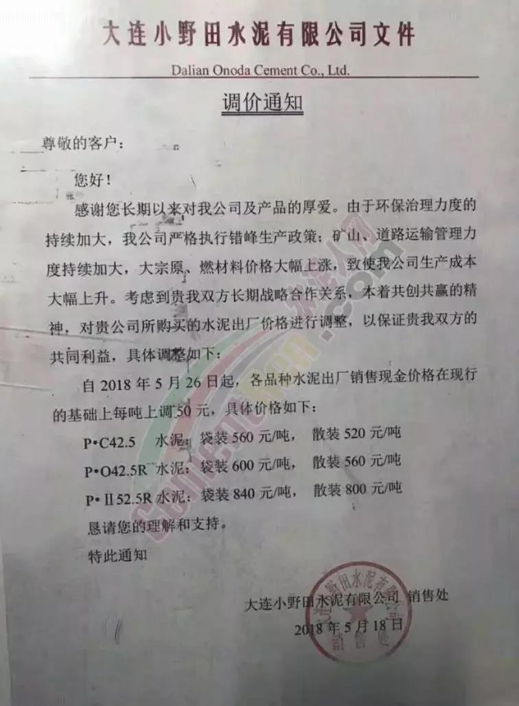 2018年5月18日大連小野田水泥有限公司銷售處發(fā)布調(diào)價通知稱,由于環(huán)保治理力度的持續(xù)大加,公司嚴(yán)格執(zhí)行錯峰生產(chǎn)政策;礦山、道路運(yùn)輸管理力度加大,大宗原、燃材料價格大幅上漲,致使公司生產(chǎn)成本大幅上升。為保證企業(yè)與用戶的共同利益,將水泥價格上調(diào)。其中P.II52.5R袋裝水泥市場零售到位價在860-870元/噸。