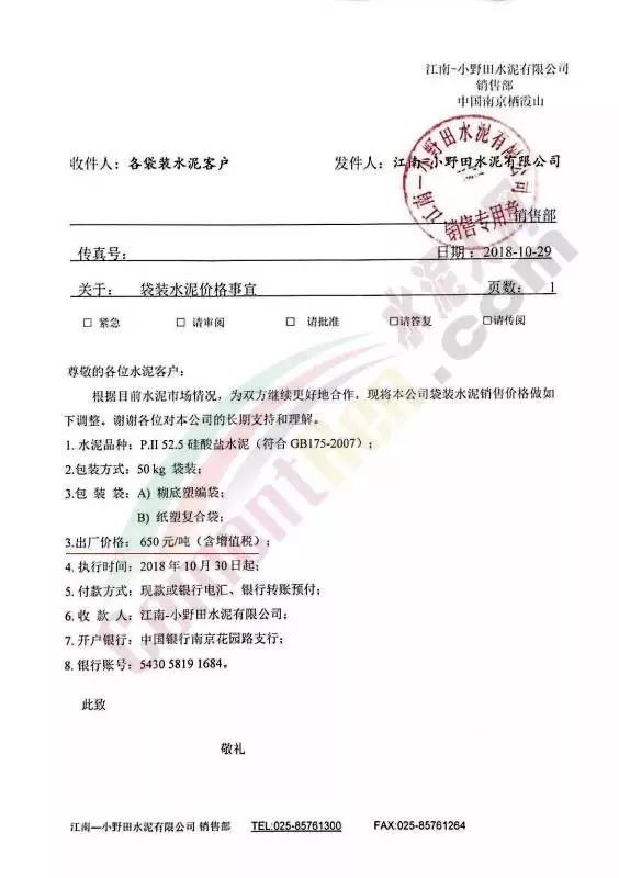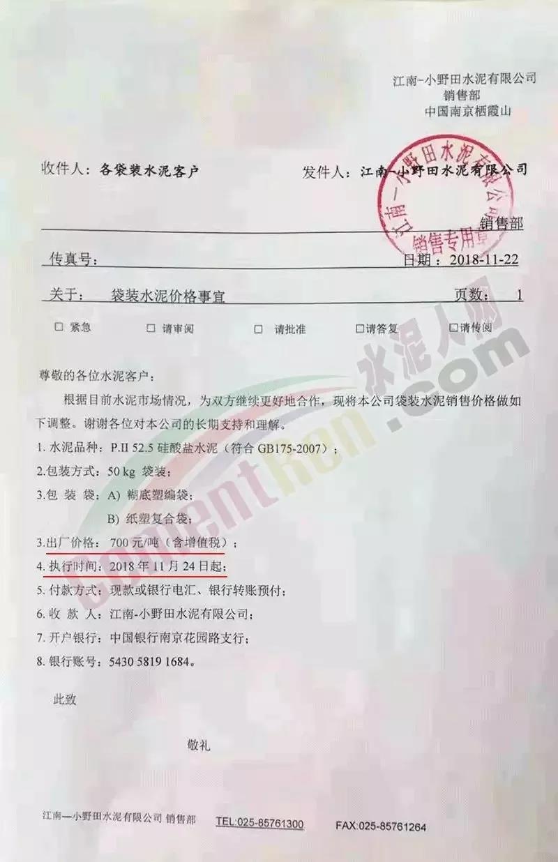 2018年10月30日江南-小野田水泥有限公司銷售部中國南京棲霞山廠發(fā)出水泥調(diào)價通知稱:根據(jù)目前水泥市場情況,為雙方繼續(xù)更好的合作,將公司袋裝水泥銷售價格上調(diào)。上調(diào)之后執(zhí)行價高達(dá)650元/噸。時隔月余這家企業(yè)再發(fā)通知上調(diào)P.II52.5硅酸鹽水泥價格,上調(diào)后出廠價格執(zhí)行700元/噸,市場到位達(dá)接近800元/噸。