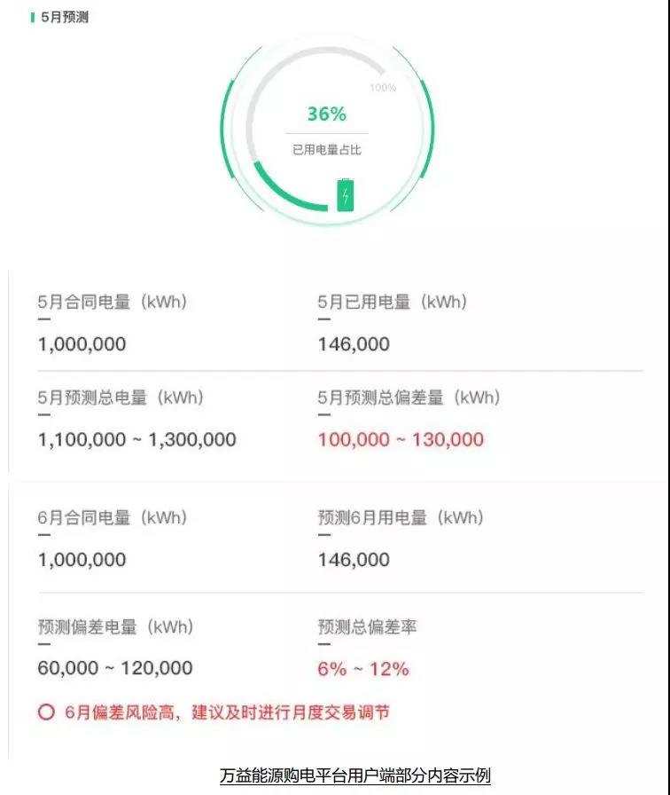 在對(duì)企業(yè)用能數(shù)據(jù)及生產(chǎn)數(shù)據(jù)進(jìn)行實(shí)時(shí)監(jiān)控的過(guò)程中,萬(wàn)益能源購(gòu)電平臺(tái)能夠?qū)ζ髽I(yè)當(dāng)月電量的使用情況進(jìn)行實(shí)時(shí)的監(jiān)控及提示。通過(guò)實(shí)時(shí)提示,企業(yè)可根據(jù)實(shí)際情況調(diào)整用電計(jì)劃,控制偏差,為能源的管理帶來(lái)了便利。