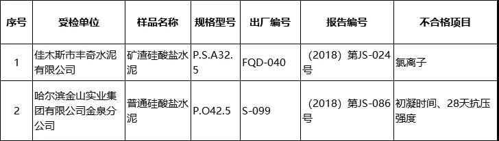 通過檢驗,佳木斯市豐奇水泥有限公司生產(chǎn)的礦渣硅酸鹽水泥的氯離子和哈爾濱金山實業(yè)集團有限公司金泉分公司生產(chǎn)的普通硅酸鹽水泥的初凝時間、28天抗壓強度等指標,分別超出國家標準GB 175-2007《通用硅酸鹽水泥》中技術要求,判定為不合格(上述不合格產(chǎn)品具體情況詳見質檢報告)。