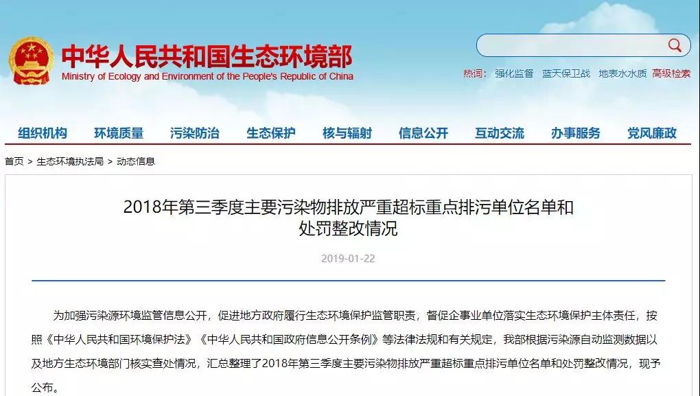 水泥人網(wǎng)消息,日前生態(tài)環(huán)境部生態(tài)環(huán)境執(zhí)法局公布《2018年第三季度主要污染物排放嚴重超標重點排污單位名單和處罰整改情況》。