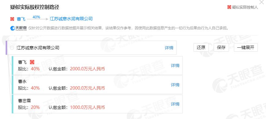 天眼查數(shù)據(jù)顯示,江蘇誠(chéng)意水泥有限公司法定代表人曹忠雪,其擁有公司20%的股份?! ?/p>