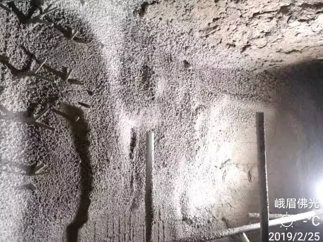 四川峨勝:2018年4月在2號(hào)窯前窯口下方直墻開(kāi)始使用噴涂料,至2019年2月已使用約10個(gè)月,目前厚度和周邊澆注料相同,沒(méi)有異常磨損,且外殼溫度比澆注料低30度左右。噴涂料更加安全、高效和節(jié)能。