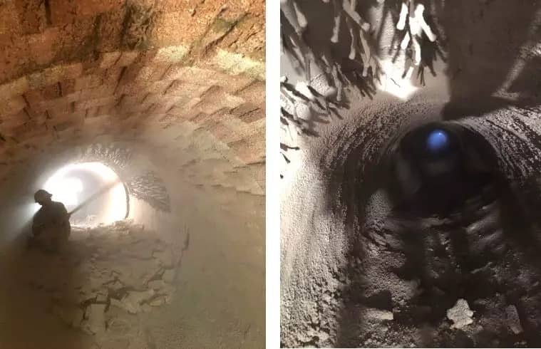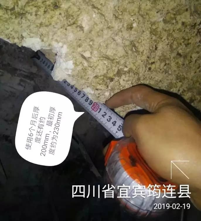 四川筠連西南水泥:2018年8月在前窯口下方直墻開(kāi)始使用噴涂料,至2019年2月已使用約6個(gè)月,暫無(wú)任何異常,噴涂厚度230mm,現(xiàn)厚度約為200mm。