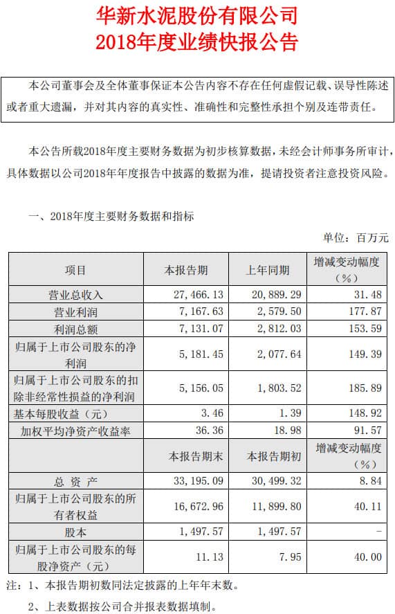 3月2日,華新水泥股份有限公司公布了2018年度快報(bào)公告,公司2018年度營業(yè)總收入274.66億元,同比增長31.48%;凈利潤51.81億元,同比增長149.39%;基本每股收益3.46元。