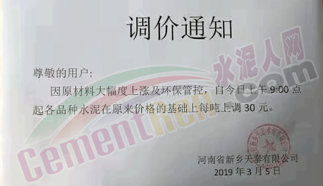 3月5日河南省新鄉(xiāng)天泰有限公司發(fā)布調(diào)價通知稱,因原材料大幅度上漲及環(huán)保管控,自3月5日上午9:00起各品種水泥在原價格基礎(chǔ)上每噸上調(diào)30元/噸。