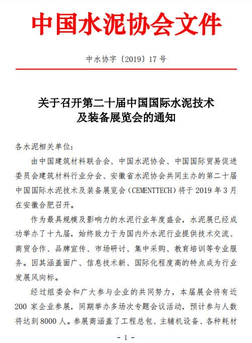 中國水泥協(xié)會、中國國際貿(mào)易促進(jìn)委員會建筑材料行業(yè)分會、安徽省水泥協(xié)會共同主辦的第二十屆中國國際水泥技術(shù)及裝備展覽會(CEMENTTECH)將于 2019 年 3 月在安徽合肥召開。通知全文如下: