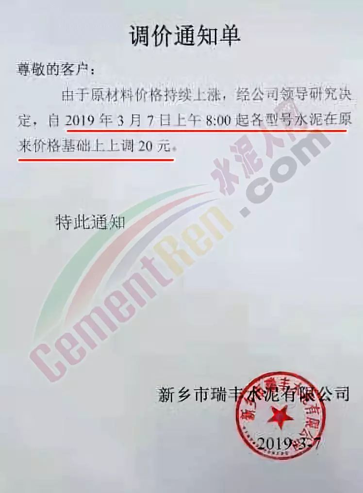 昨日(3月7日)新鄉(xiāng)瑞豐水泥有限公司再次發(fā)布調(diào)價(jià)通知,各型號水泥在原有價(jià)格基礎(chǔ)上上調(diào)20元/噸。這是這家企業(yè)繼3月2日之后的第二次價(jià)格上調(diào)。調(diào)價(jià)通知如下: