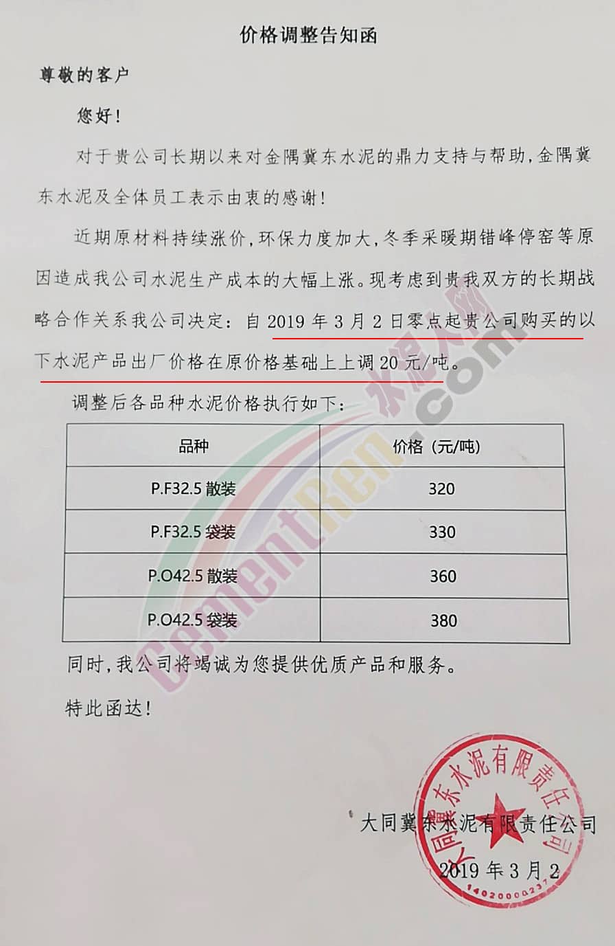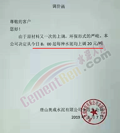 唐山奧成水泥有限公司金盾分公司調(diào)價(jià)函稱:由于原材料又一次的上調(diào),環(huán)保形勢嚴(yán)峻,公司決定自3月7日8時(shí)起,每種水泥上調(diào)價(jià)格20元/噸。