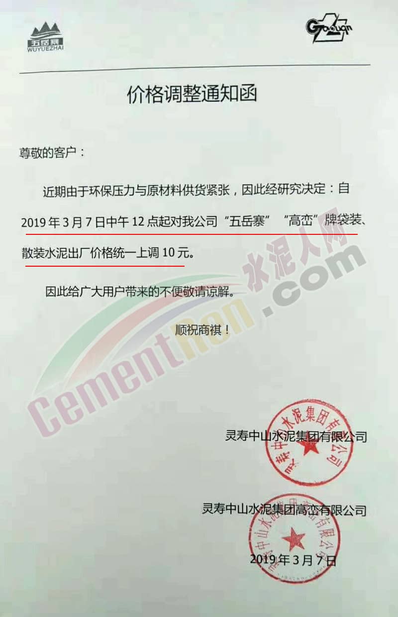 石家莊靈壽中山水泥集團(tuán)有限公司調(diào)價(jià)通知稱由于近期環(huán)保壓力與原料供應(yīng)緊張,公司自3月7日中午12時(shí)起,對袋裝、散裝水泥出廠價(jià)統(tǒng)一上調(diào)10元/噸。