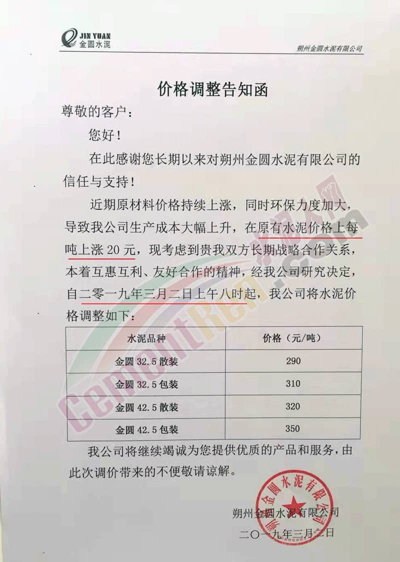 山西朔州金圓水泥也于同日(3月2日)發(fā)布類似調(diào)價(jià)通知,通知原文如下: