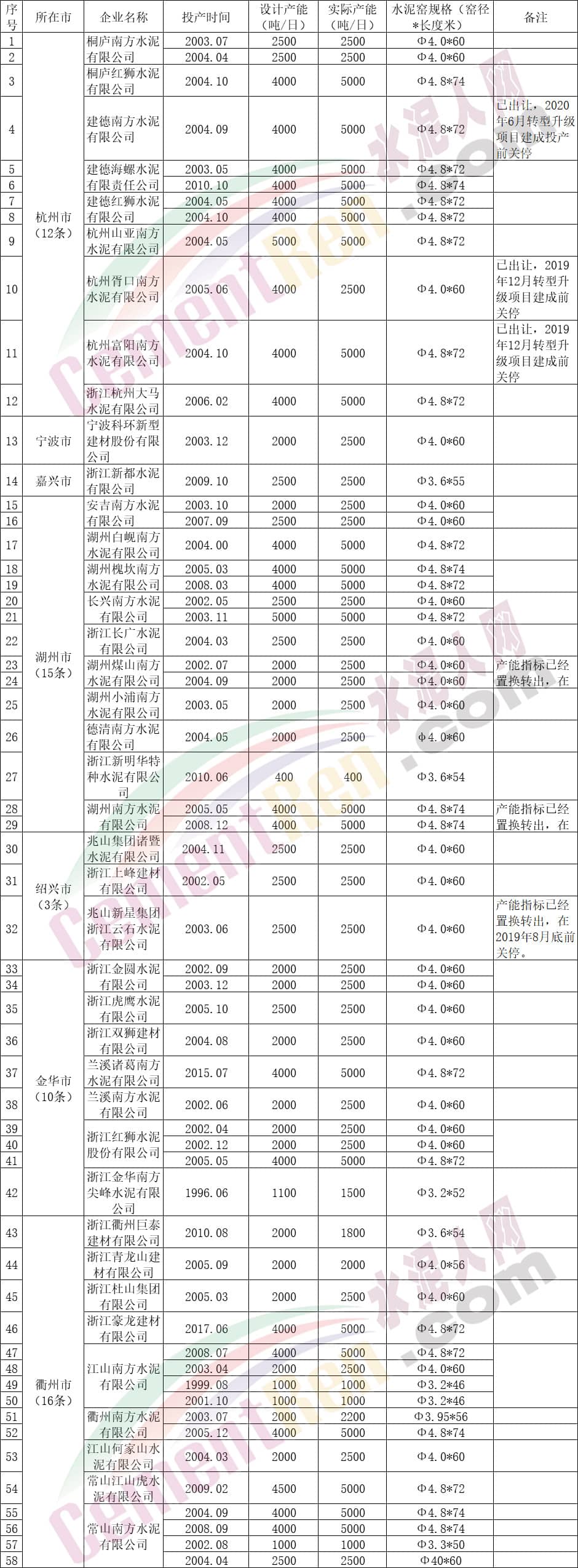 另外,2010年10月投產(chǎn)的建德海螺水泥有限責(zé)任公司、2015年7月投產(chǎn)的蘭溪諸葛南方水泥有限公司以及2017年6月投產(chǎn)的浙江豪龍建材有限公司三條熟料生產(chǎn)線均為設(shè)計產(chǎn)能4000t/d,實際產(chǎn)能5000t/d。