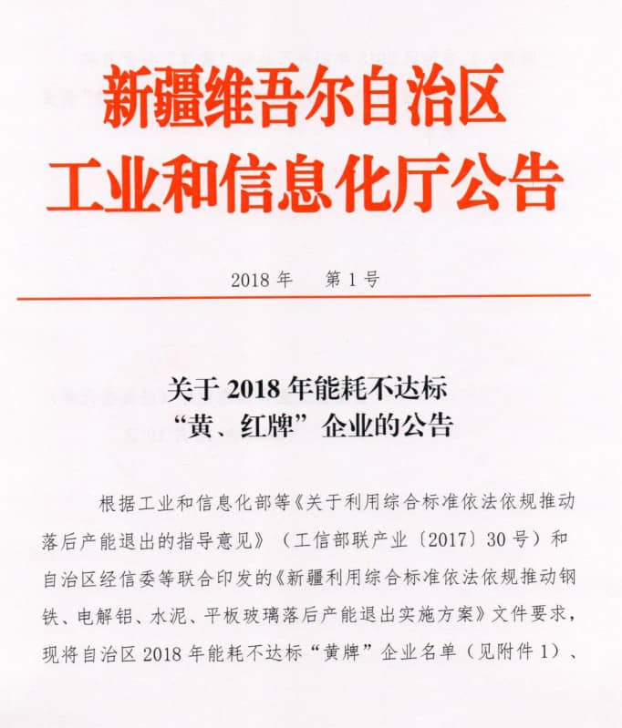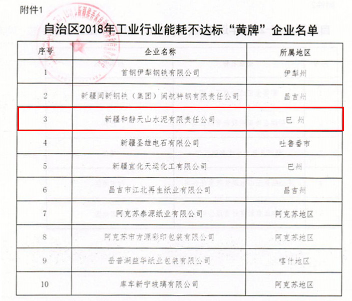 據(jù)水泥人網(wǎng)了解,在2018年12月,新疆維吾爾自治區(qū)工信廳發(fā)布了《關(guān)于2018年能耗不達(dá)標(biāo)“黃、紅牌”企業(yè)的公告》,公告中提到新疆和靜天山水泥有限責(zé)任公司被列為新疆2018年工業(yè)行業(yè)能耗不達(dá)標(biāo)“黃牌”企業(yè)。