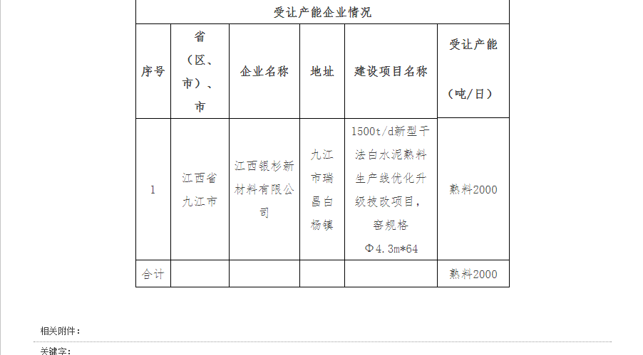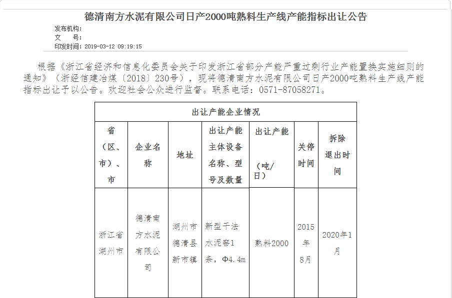 根據(jù)《浙江省經(jīng)濟(jì)和信息化委員會關(guān)于印發(fā)浙江省部分產(chǎn)能嚴(yán)重過剩行業(yè)產(chǎn)能置換實(shí)施細(xì)則的通知》現(xiàn)將德清南方水泥有限公司日產(chǎn)2000噸熟料生產(chǎn)線產(chǎn)能指標(biāo)出讓予以公告。