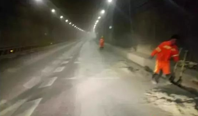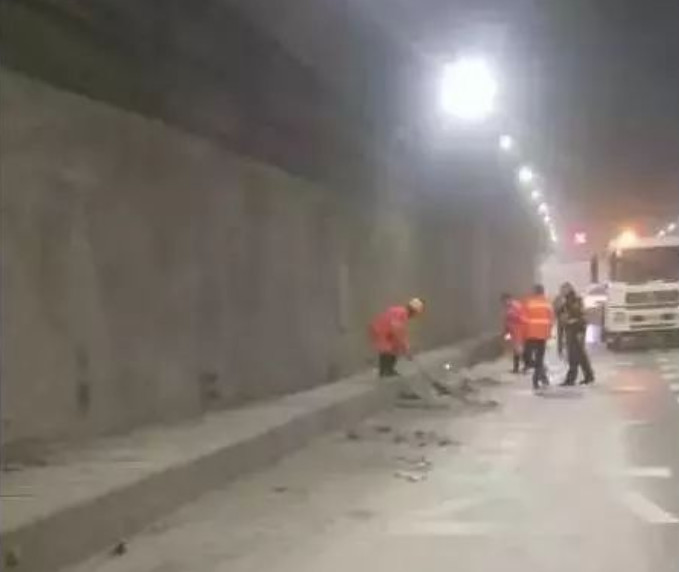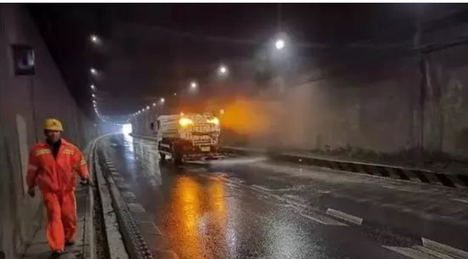 因?yàn)樗嗍欠蹓m類物質(zhì),加上隧道空間狹窄,極不好清理。繞城高速西南段分公司立即組織養(yǎng)護(hù)人員20余人進(jìn)行人工作業(yè),清掃作業(yè)車、灑水車、水炮降塵車等九個(gè)來(lái)回進(jìn)行沖洗、降塵;