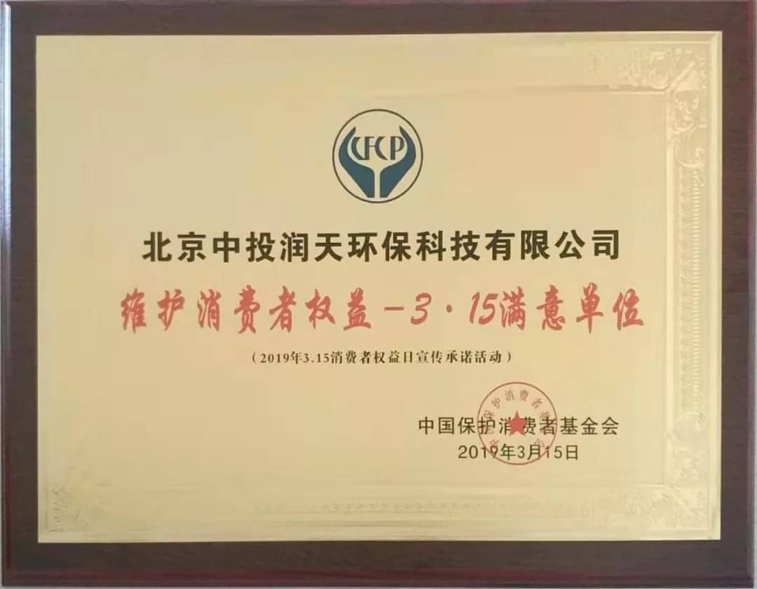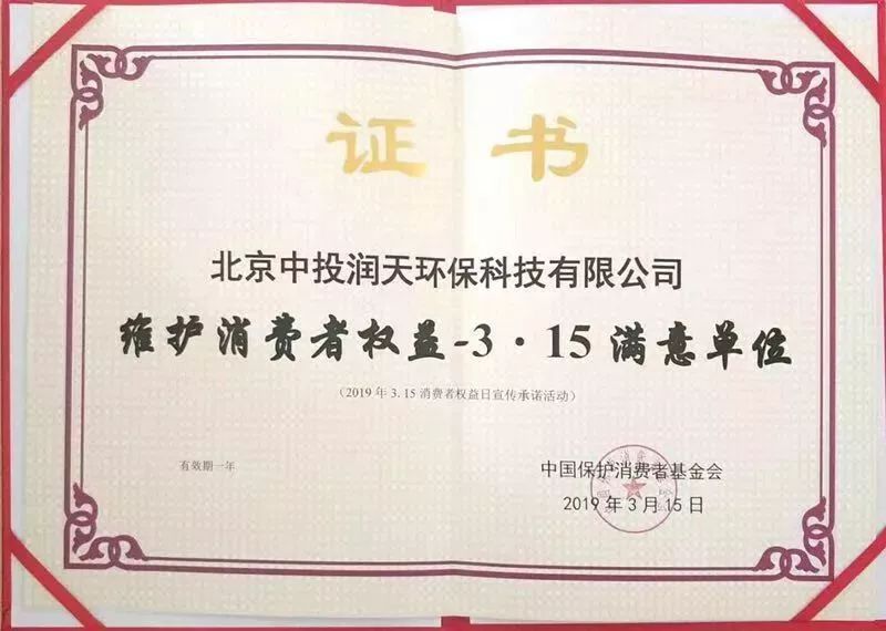北京中投潤天環(huán)保榮獲3.15維護(hù)消費者權(quán)益滿意單位