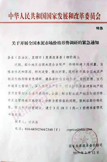 請各省聯(lián)合當?shù)毓I(yè),自然資源,生態(tài)環(huán)境等主管部門,深入水泥生產(chǎn)企業(yè)、行業(yè)協(xié)會及基建房地產(chǎn)投資開發(fā)等相關(guān)企業(yè)開展調(diào)研。全面了解當前水泥產(chǎn)銷及價格形勢、有關(guān)監(jiān)管措施實施情況,分析當前存在的問題,預判后期價格走勢,提出有關(guān)政策建議。并于3月18日(周一)前將各省情況書面報告。通知原文如下: