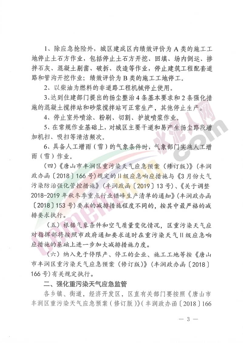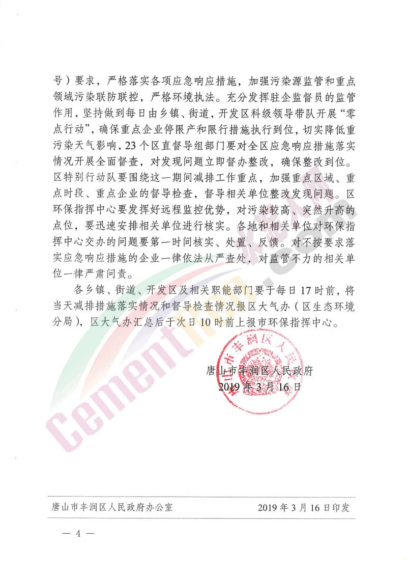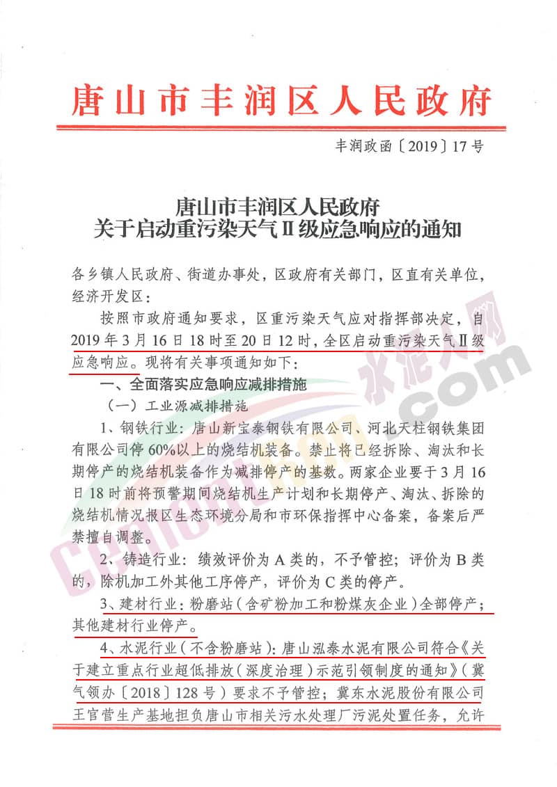 據(jù)水泥人網(wǎng)了解,同一日唐山市政府也發(fā)布了相關(guān)通知,通知稱:按照省大氣辦《關(guān)于啟動區(qū)域一和區(qū)域二Ⅱ級應(yīng)急響應(yīng)的通知》要求,根據(jù)近日氣象擴(kuò)散條件,市重污染天氣應(yīng)對指揮部決定自2019年3月16日18時至20日12時,全市啟動重污染天氣Ⅱ級應(yīng)急響應(yīng)。