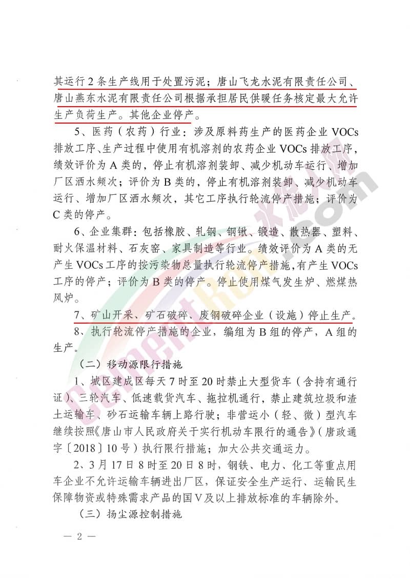 礦山開采、礦石破碎企業(yè)(設(shè)施)停止生產(chǎn)。執(zhí)行輪流停產(chǎn)措施的企業(yè),編組為B組的停產(chǎn),A組的生產(chǎn)。