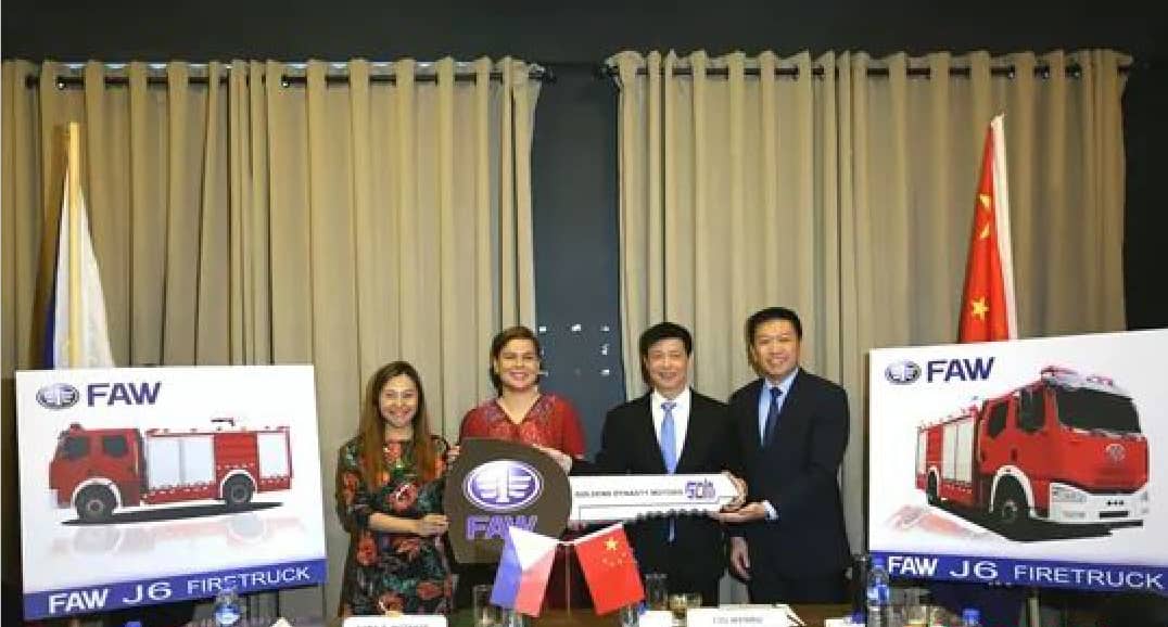 圖為劉文儒向達(dá)沃市長薩拉·杜特爾特交付消防車,達(dá)沃市議員April Marie Dayap(左一),中國駐菲律賓達(dá)沃總領(lǐng)事黎林(右一)參加捐贈儀式。達(dá)沃市與晉江市2018年11月正式締結(jié)為友城。中新社記者 朱亞雯 攝
