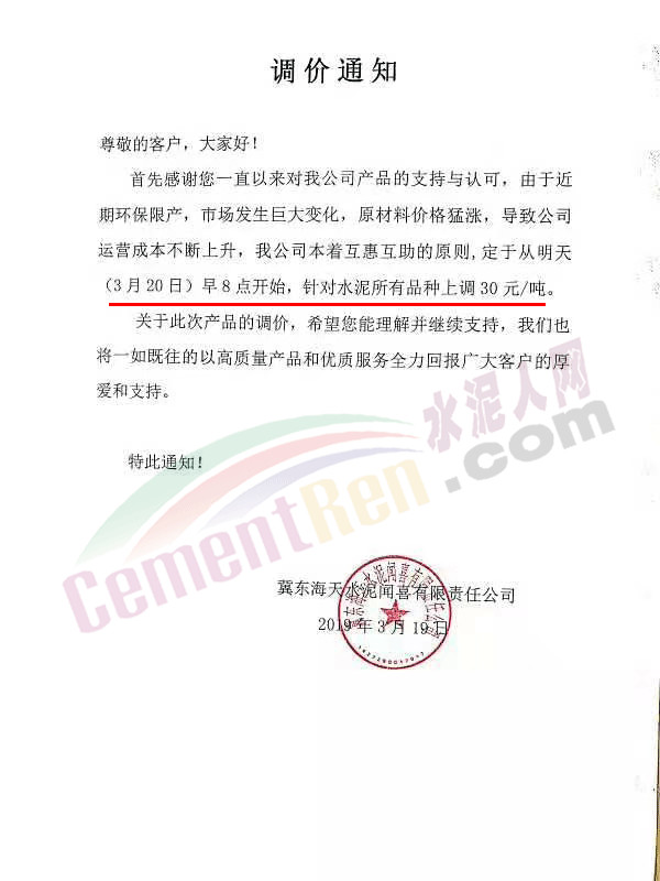冀東海天水泥聞喜有限責(zé)任公司調(diào)價(jià)通知稱(chēng)由于近期環(huán)保限產(chǎn),市場(chǎng)發(fā)生巨大變化,原材料價(jià)格猛漲,導(dǎo)致公司運(yùn)營(yíng)成本不斷上升。定于3月20日早8點(diǎn)開(kāi)始針對(duì)水泥所有品種上調(diào)30元/噸。