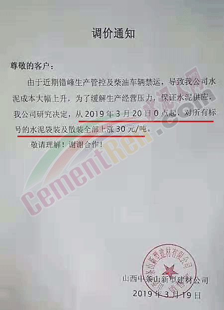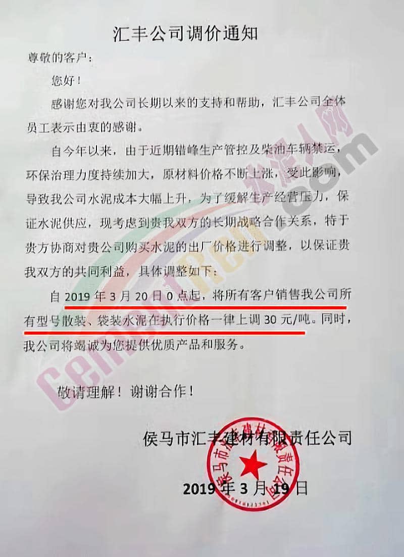 侯馬市匯豐建材有限責(zé)任公司調(diào)價(jià)通知稱(chēng)自今年以來(lái),由于近期錯(cuò)峰生產(chǎn)管控及柴油車(chē)輛禁運(yùn),環(huán)保治理力度持續(xù)加大,原材料價(jià)格不斷上漲,受此影響導(dǎo)致公司水泥成本上升,為了緩解生產(chǎn)經(jīng)營(yíng)壓力,保證水泥供應(yīng)。定于3月20日零點(diǎn)起上調(diào)所有型號(hào)散裝、袋裝水泥價(jià)格,上幅幅度為30元/噸。