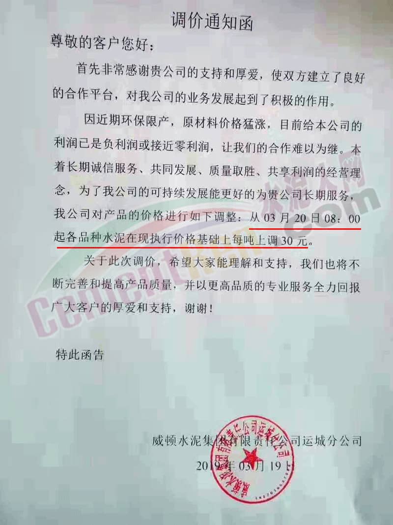 威頓水泥集團(tuán)有限責(zé)任公司運(yùn)城分公司調(diào)價(jià)通知函稱(chēng),因近期環(huán)保限產(chǎn),原材料價(jià)格猛漲,目前公司利潤(rùn)已是負(fù)利潤(rùn)或接近零利潤(rùn)。本著長(zhǎng)期誠(chéng)信服務(wù),共同發(fā)展,質(zhì)量取勝,共享利潤(rùn)的經(jīng)營(yíng)理念。同時(shí),為了公司的可持續(xù)發(fā)展,為客戶(hù)更好的服務(wù),定于3月20日8時(shí)起各品種水泥在原執(zhí)行價(jià)格基礎(chǔ)上每噸上調(diào)30元。