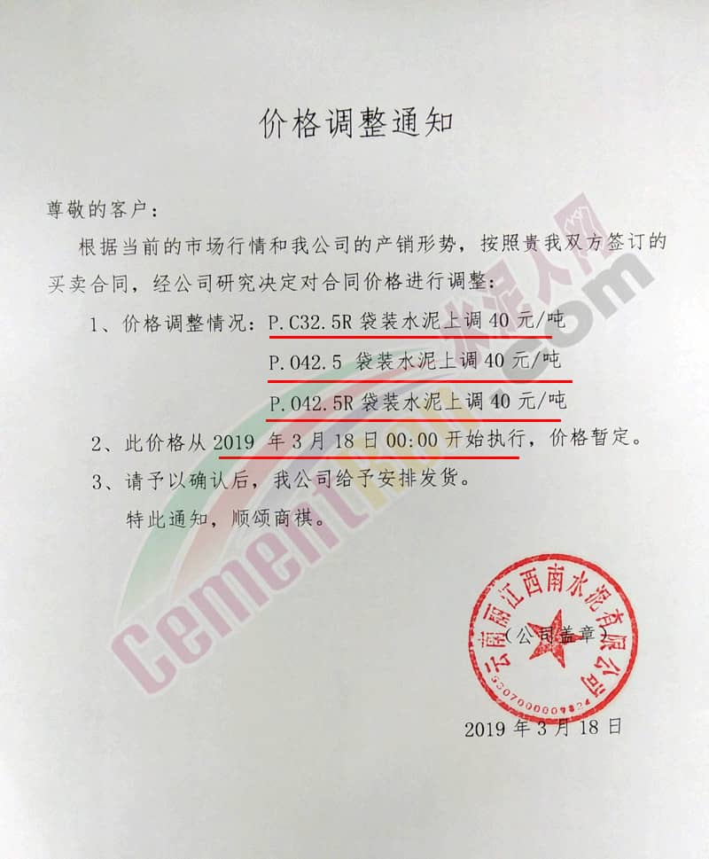 云南麗江西南水泥同期發(fā)給外圍經(jīng)銷(xiāo)商的價(jià)格調(diào)整確認(rèn)函稱(chēng),根據(jù)當(dāng)前的市場(chǎng)行情和公司的產(chǎn)銷(xiāo)形勢(shì)。經(jīng)公司研究決定從2019年3月18日00.00開(kāi)始對(duì)合同價(jià)格進(jìn)行調(diào)整:其中P.C32.5R 袋裝水泥上調(diào)70元/噸。P.042.5 袋裝水泥上調(diào)90元/噸。