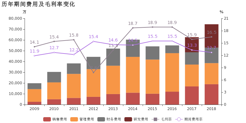 公司2018年期間費用率為12.7%,較去年下降0.6個百分點。期間費用合計達7.5億,同比上升19.2%。其中銷售費用為1.9億,同比上升12.2%;管理費用為2億,同比下降3.6%;財務費用為1.4億,同比上升26.1%;研發(fā)費用為2.2億,同比上升55%。營業(yè)成本48.9億,同比增長23.5%,低于營業(yè)收入24.5%的增速,導致毛利率上升0.7%。