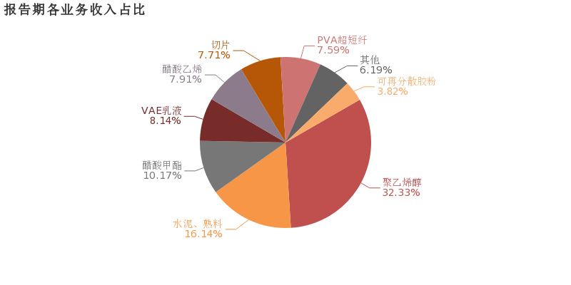 公司聚乙烯醇(PVA)產品的產銷量和市場占有率均超過國內市場的30%以上,高強高模聚乙烯醇(PVA)纖維產品產銷量達國內總量的80%,國際市場占有率為45%左右,其他產品如水泥、熟料、可再分散性膠粉、PVB樹脂已成為同行業(yè)的知名品牌。公司秉持“延伸產業(yè)鏈、拓寬產業(yè)面”的發(fā)展規(guī)劃,立足PVA產業(yè)鏈、做大做強主業(yè),逐步建成了化工、化纖、新材料、建材四大主業(yè)。