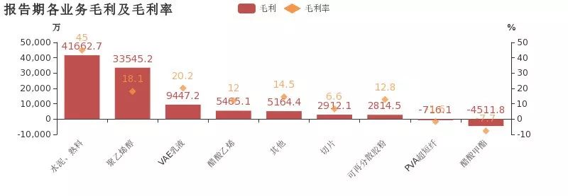 利潤貢獻角度,“水泥、熟料”毛利貢獻最大。報告期內,企業(yè)綜合毛利率為16.5%。其中,“水泥、熟料”、“聚乙烯醇”、“VAE乳液”毛利貢獻占比分別為43.5%、35%、9.9%,“水泥、熟料”貢獻較大毛利。“水泥、熟料”、“聚乙烯醇”、“VAE乳液”毛利率分別為45%、18.1%、20.2%。