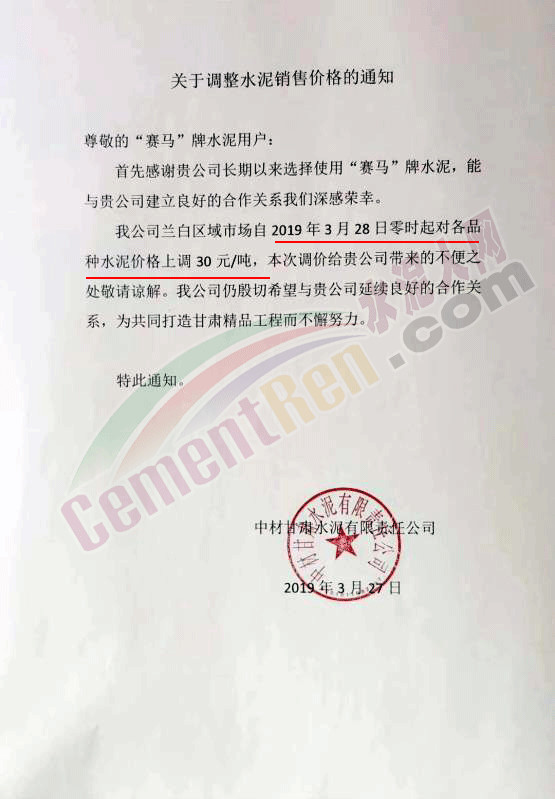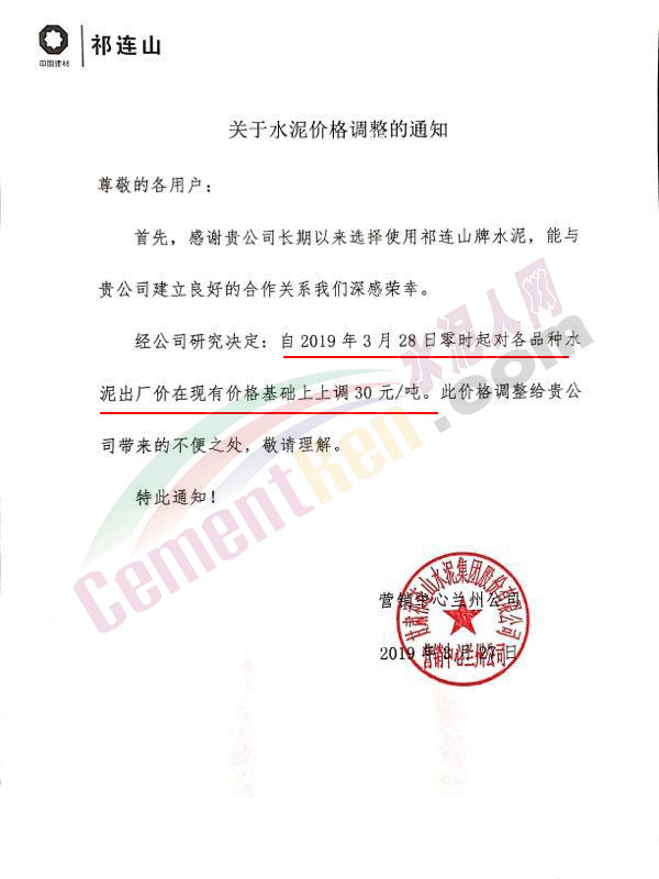 甘肅祁連山水泥集團(tuán)股份有限公司營銷中心蘭州公司調(diào)價(jià)通知稱,自今日(3月28日)零時(shí)起對(duì)各品種水泥出廠價(jià)在現(xiàn)有價(jià)格基礎(chǔ)上上調(diào)30元/噸。